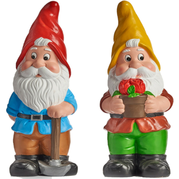 Tuinkabouter beeldjes set van 2x – Keramiek – 24.5 cm – geel/rood