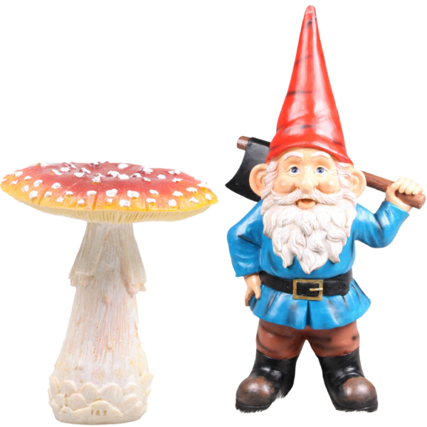 Tuinkabouter beeldje Dwerg met rode muts en bijl – en paddestoel – Keramiek – 20 cm